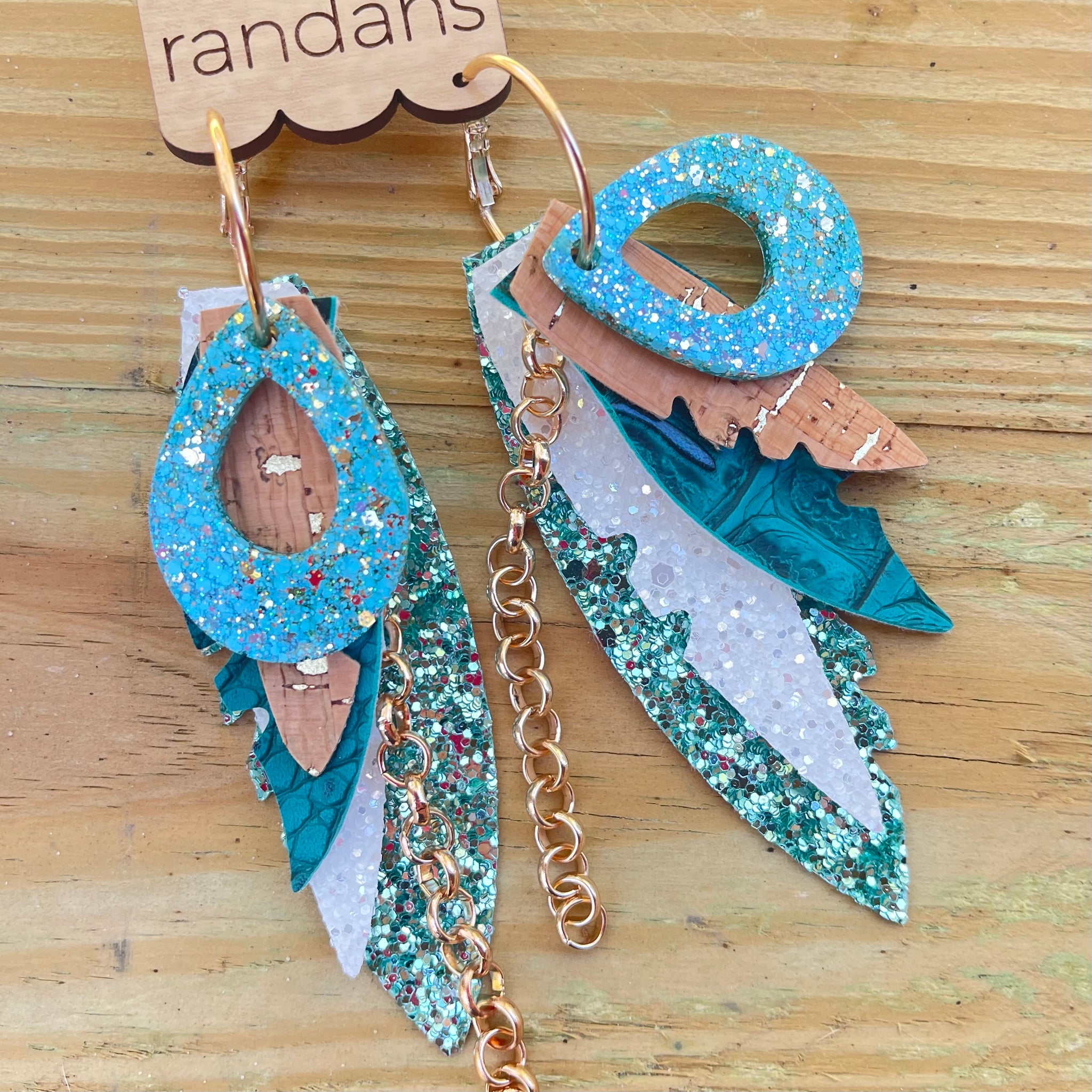 These earrings are approximately 4.5” long. Mixed metal in the chain and hoops. Fringe/feathers are made of faux leather, real leather, and vinyl. Toppers can be made from resin or laser cut acrylic, depending on what coordinates with your palette and shape chosen.