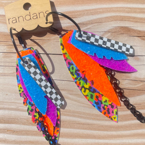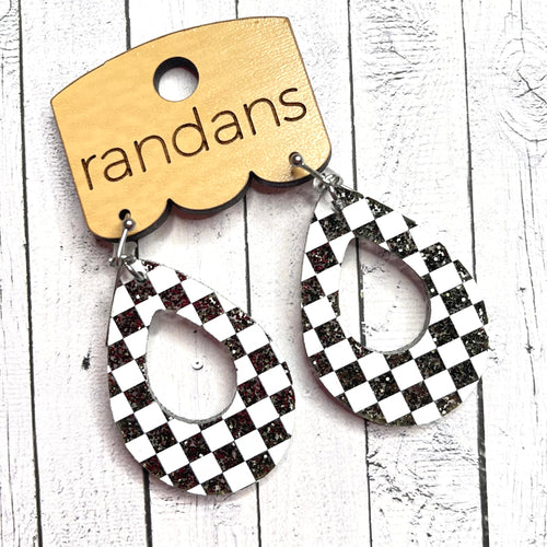 Randans resin/acrylic/wood dangle earrings- opened teardrop checkered