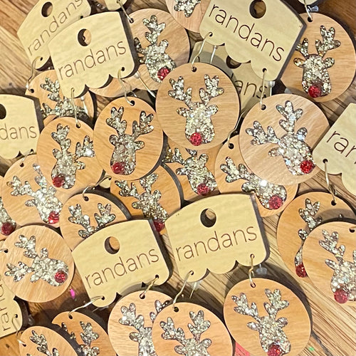 Randans resin/acrylic/wood dangle earrings- Wooden reindeer