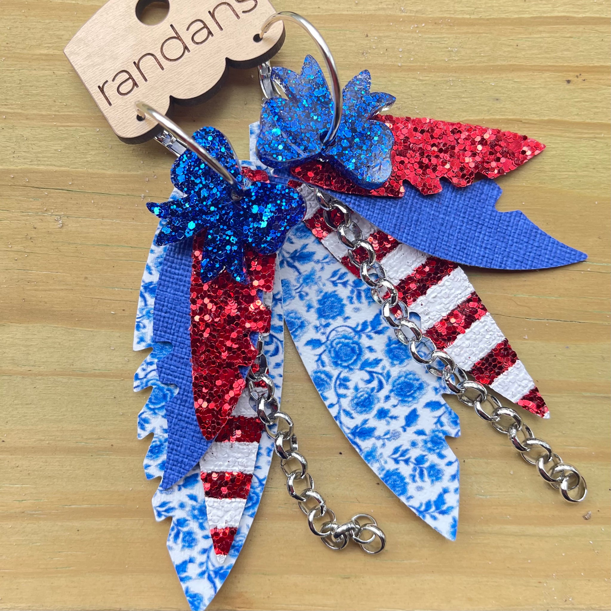 These earrings are approximately 4.5” long. Mixed metal in the chain and hoops. Fringe/feathers are made of faux leather, real leather, and vinyl. Toppers can be made from resin or laser cut acrylic, depending on what coordinates with your palette and shape chosen.